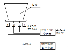 MIPS儀表將來(lái)自FBX-100C毫伏變送器的標(biāo)準(zhǔn)電流信號(hào)進(jìn)行I/V變換,A/D轉(zhuǎn)換轉(zhuǎn)成數(shù)字量,而后去皮重,按預(yù)置的數(shù)學(xué)模型和有關(guān)參數(shù)計(jì)算出料倉(cāng)中物料的重量。一方面在面板上顯示出來(lái),另一方面以標(biāo)準(zhǔn)的4~20mA電流信號(hào)將此料倉(cāng)的噸位傳給DCS(或其它種類(lèi)的上位機(jī))。